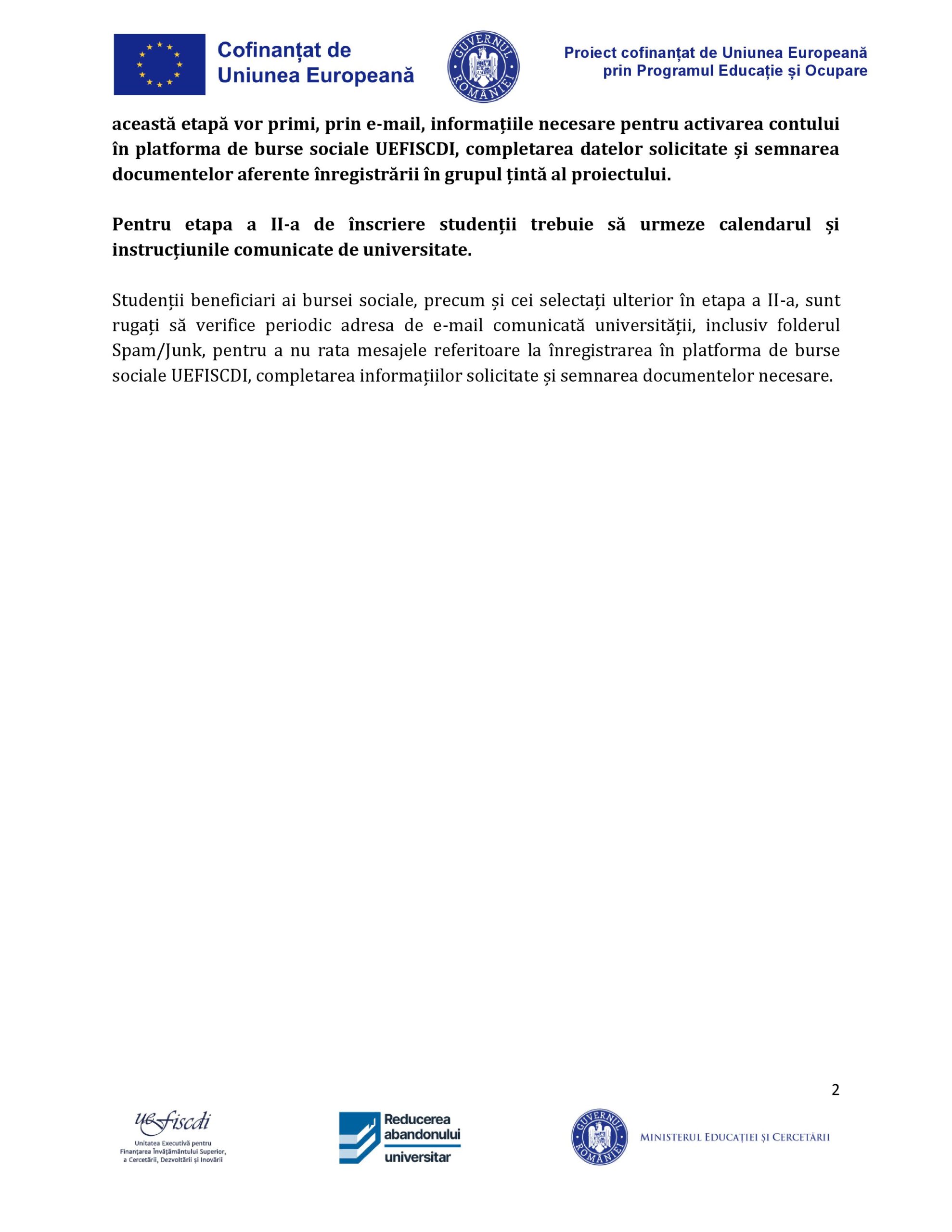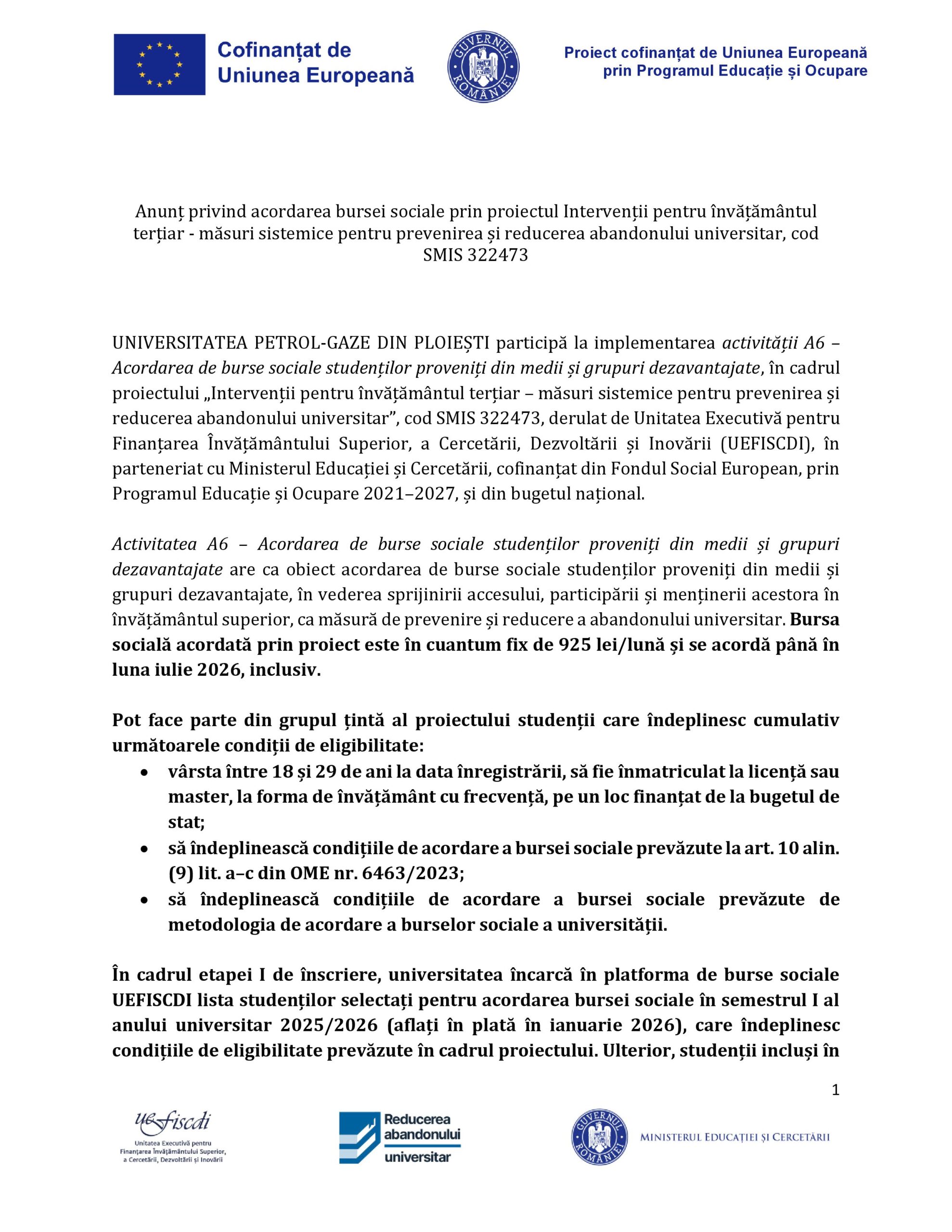 Anunț privind acordarea bursei sociale prin proiectul Intervenții pentru învățământul terțiar – măsuri sistemice pentru prevenirea și reducerea abandonului universitar, cod SMIS 322473